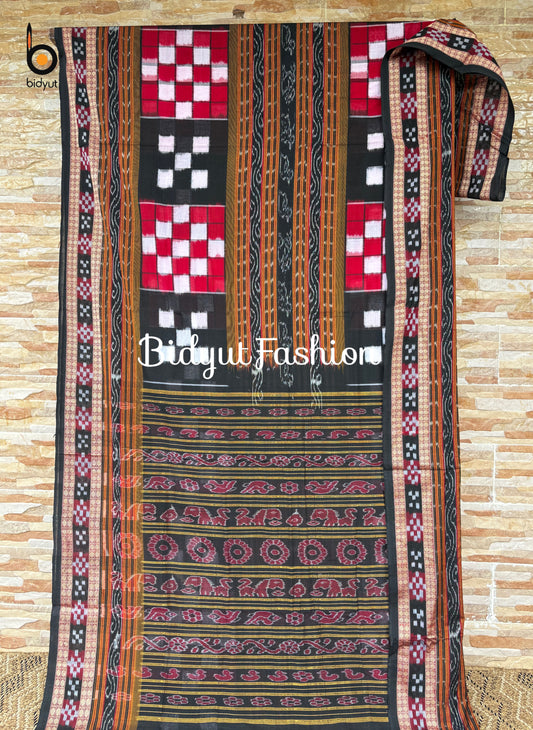 Handlooms of Odisha Sambalpuri Double Ikat border check body Silk Saree red color