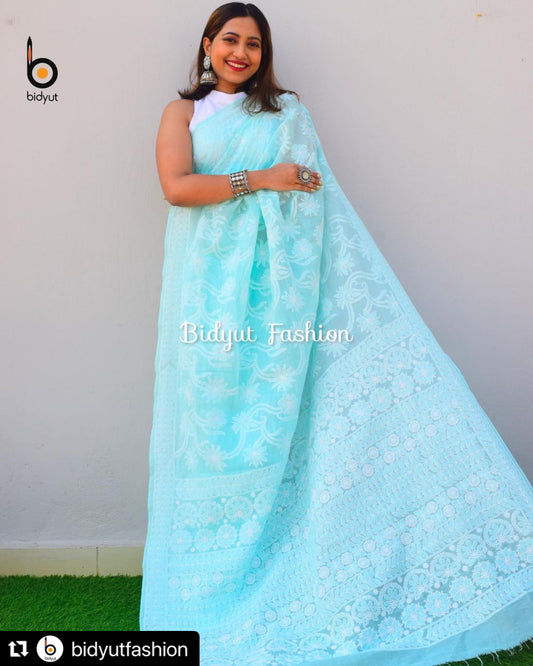 Lucknowi Chikankari all over work hand embroidery Cotton Saree