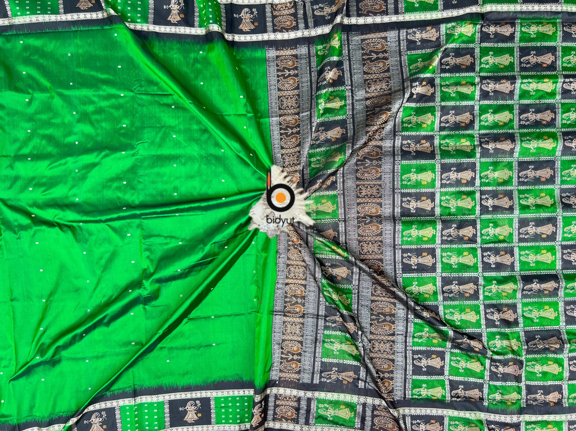 Here is a stunning green color putli design or doll motif Bomkai silk saree saree a handloom saree woven in Odisha known for its intricate extra weft weaving pattern comes both in fine cotton, and finer quality mulberry silk yarn.