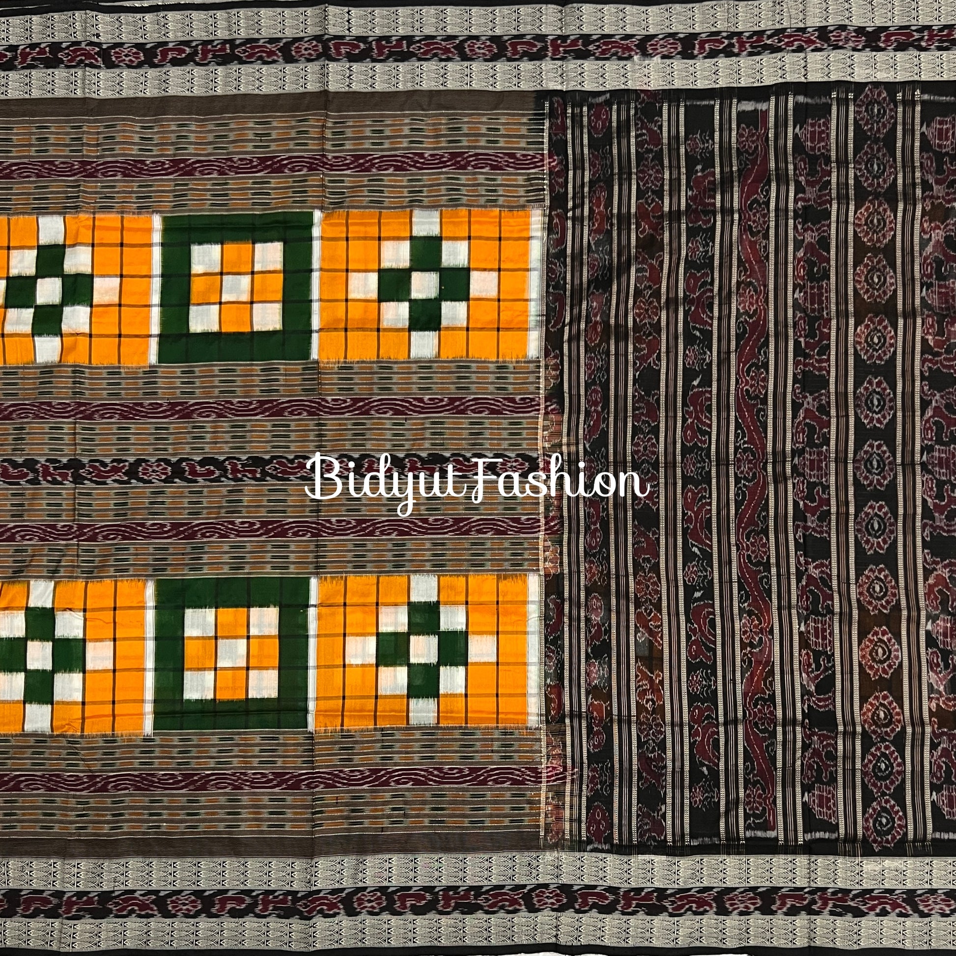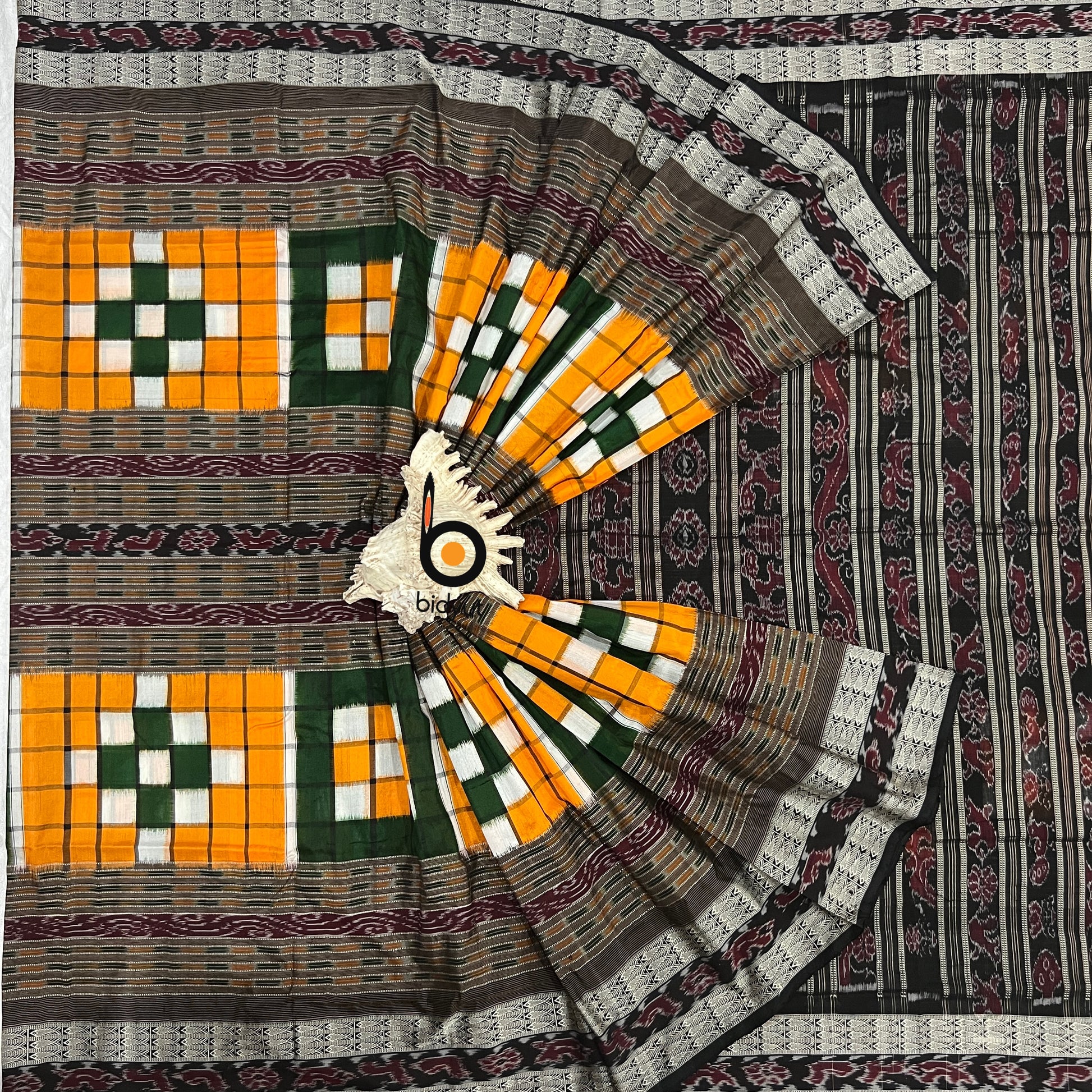 This exclusive Odisha handloom Double Ikat cotton saree popularly called Bichitrapuri in orange green black checkered color