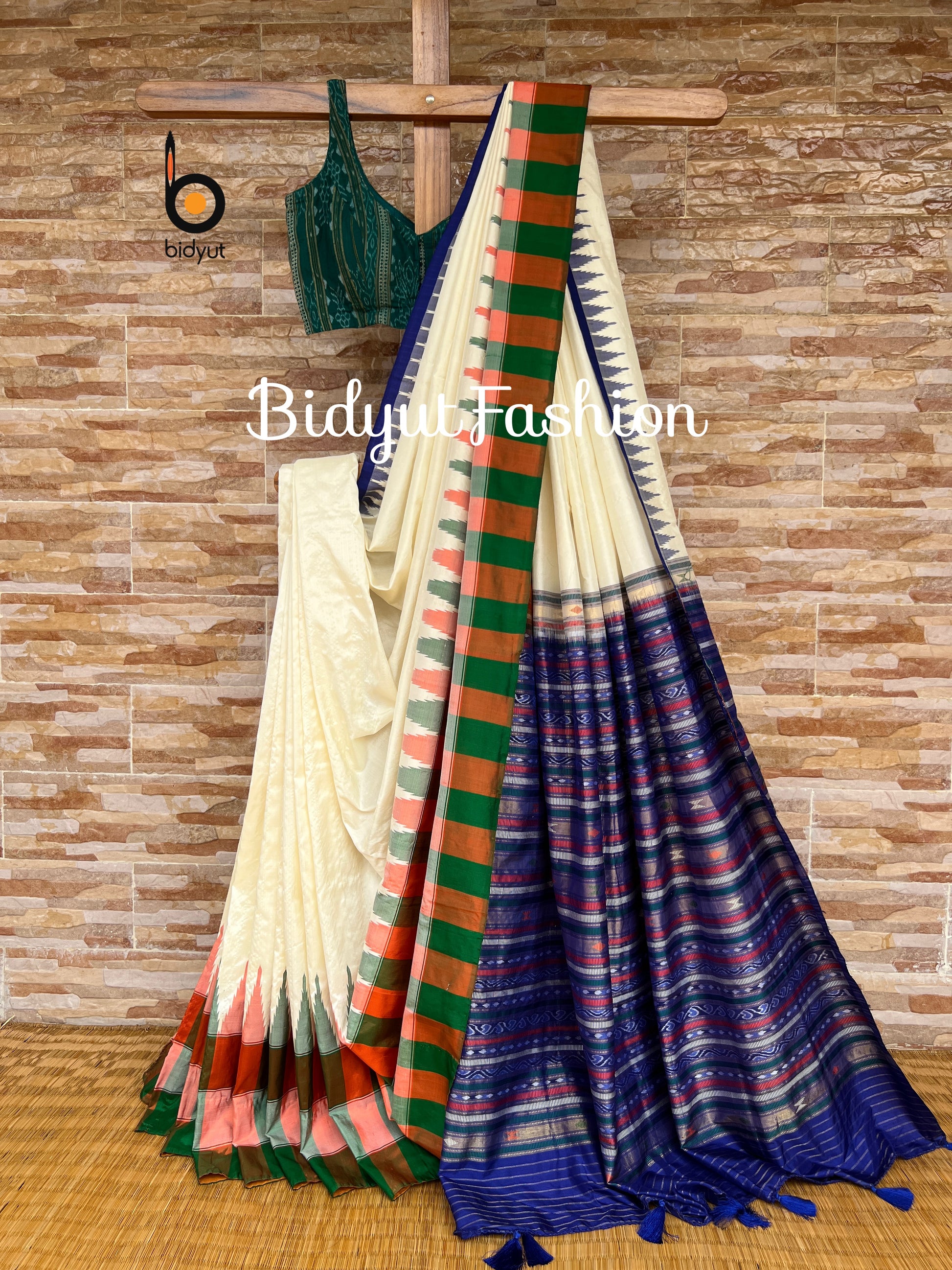Handlooms of Odisha Sambalpuri Temple motif Ikat Silk Saree White color