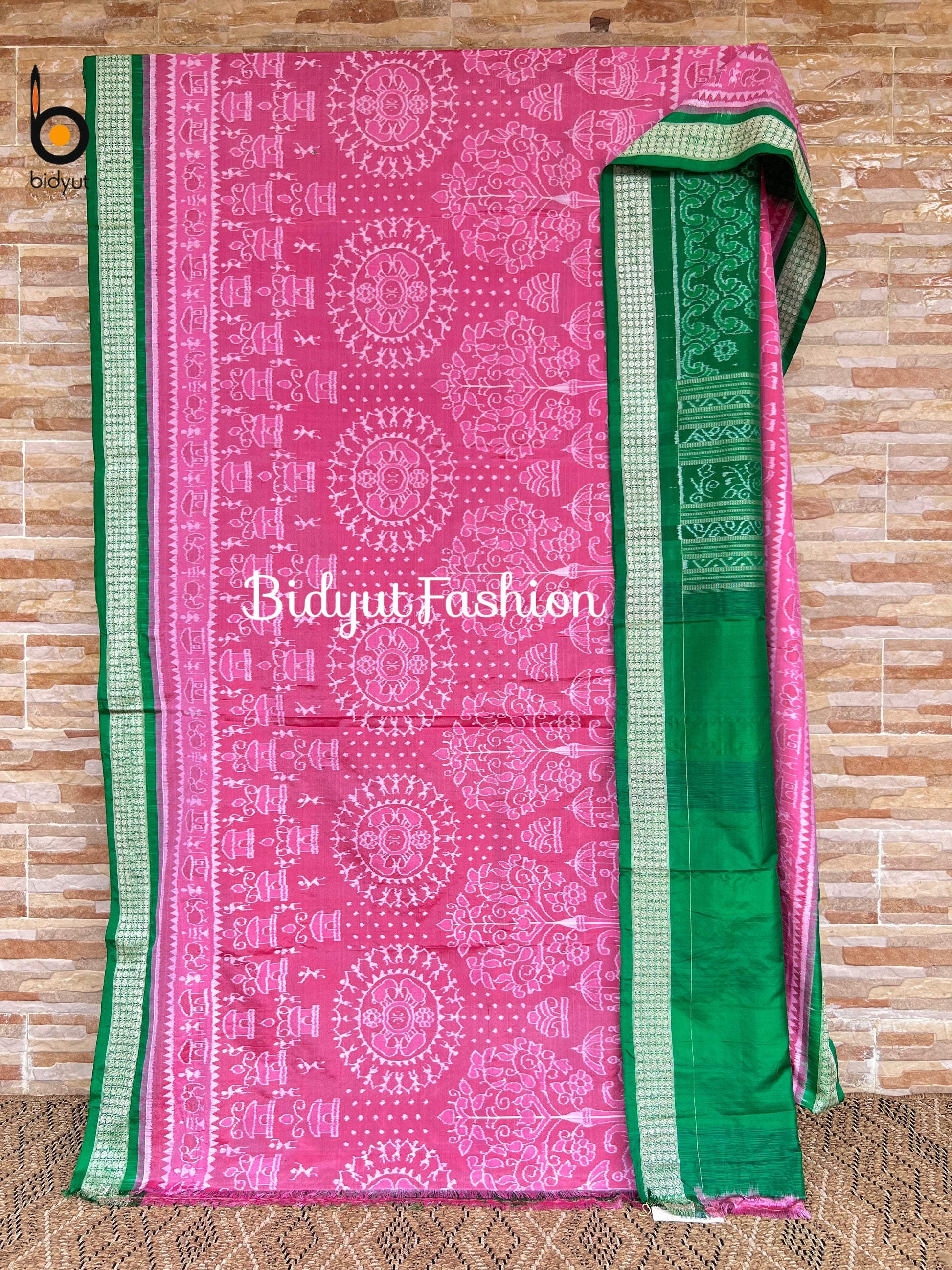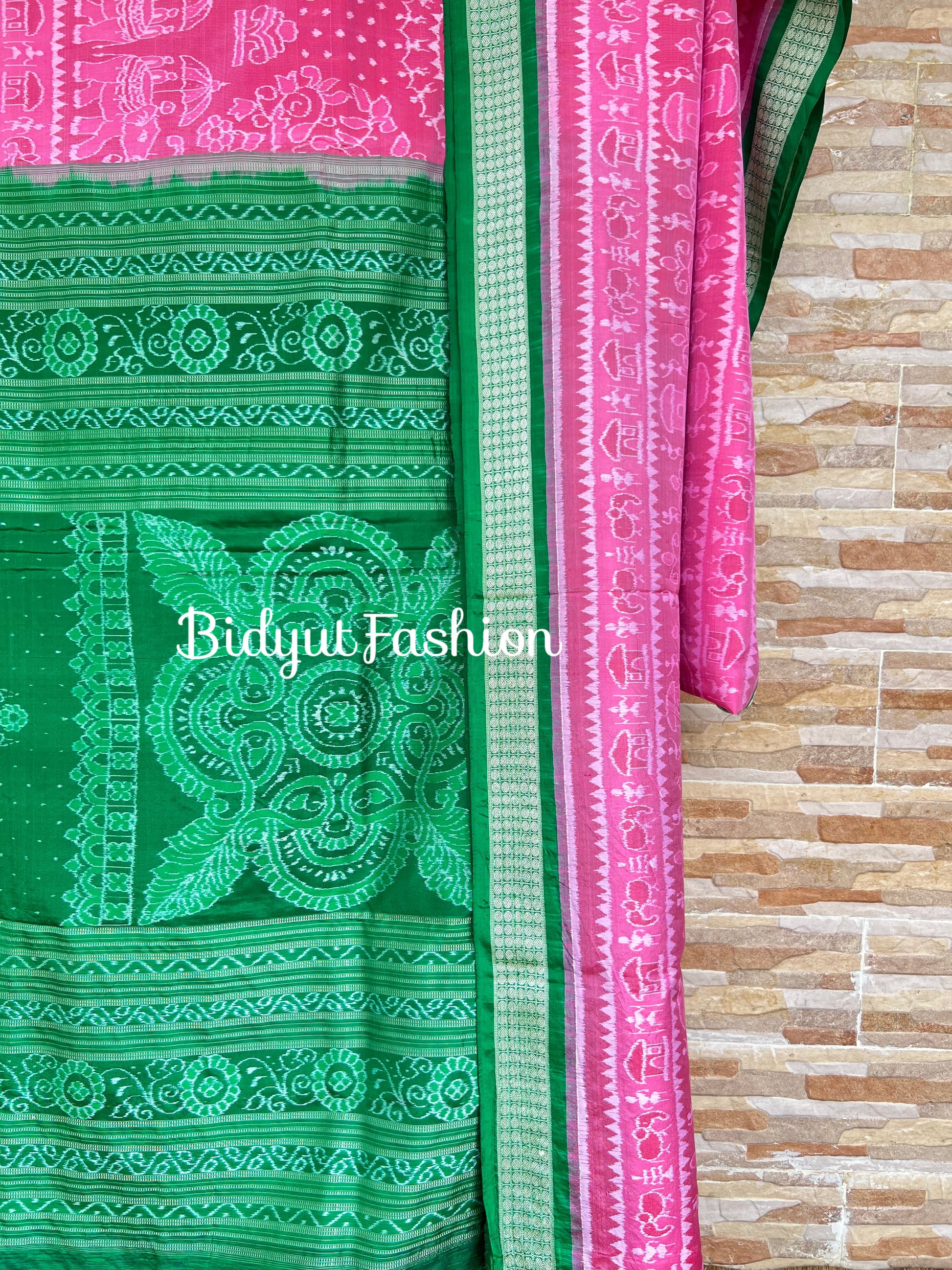 Draped in vibrant pink and rich green, this Sambalpuri Ikat silk saree is a true expression of Odisha’s timeless handloom artistry. Woven using the traditional Bandha technique, each design emerges from meticulously tie-dyed threads — a craft perfected over generations.