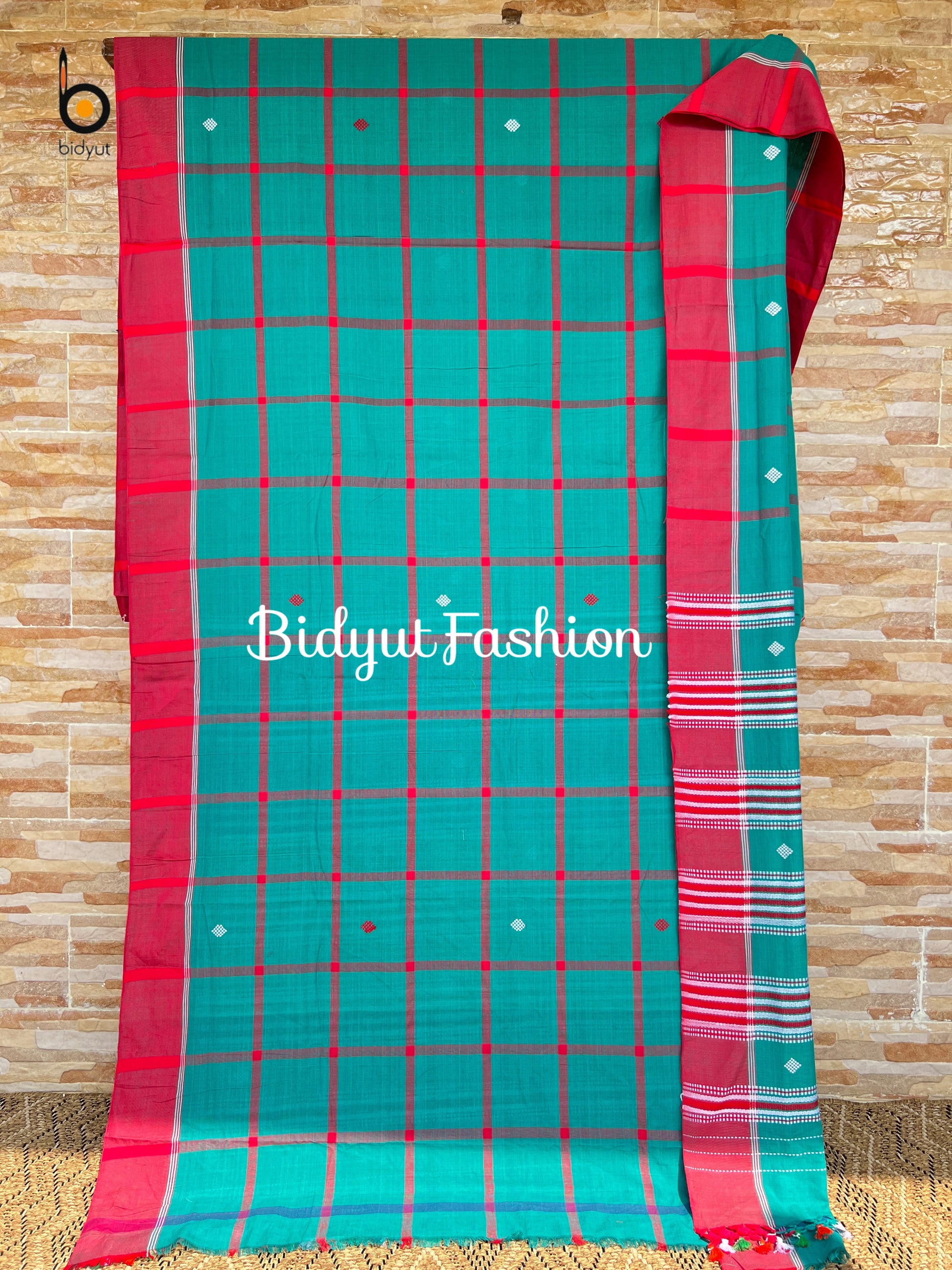 Santhal Cotton Sarees have thick low thread count checks on the body with a jaal phuta floral/bird motif. The checks and motifs get woven using contrasting colors to create a beautiful pattern.
