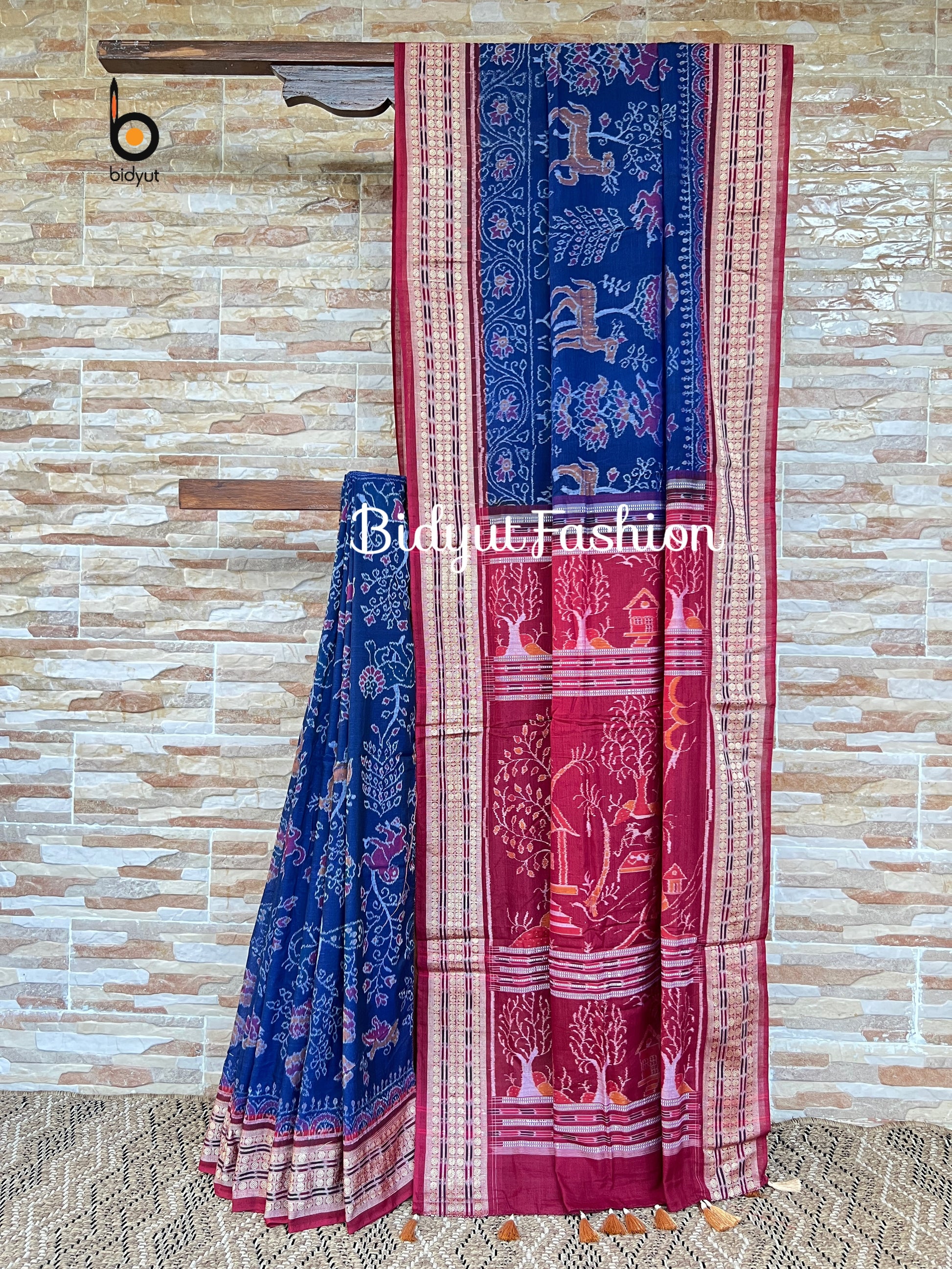 An exclusive Wild tapestry or Vana Chitta or Aranya Motif Odisha handloom Sambalpuri Ikat Cotton saree in maroon color with sandalwood color contrast blouse and palla