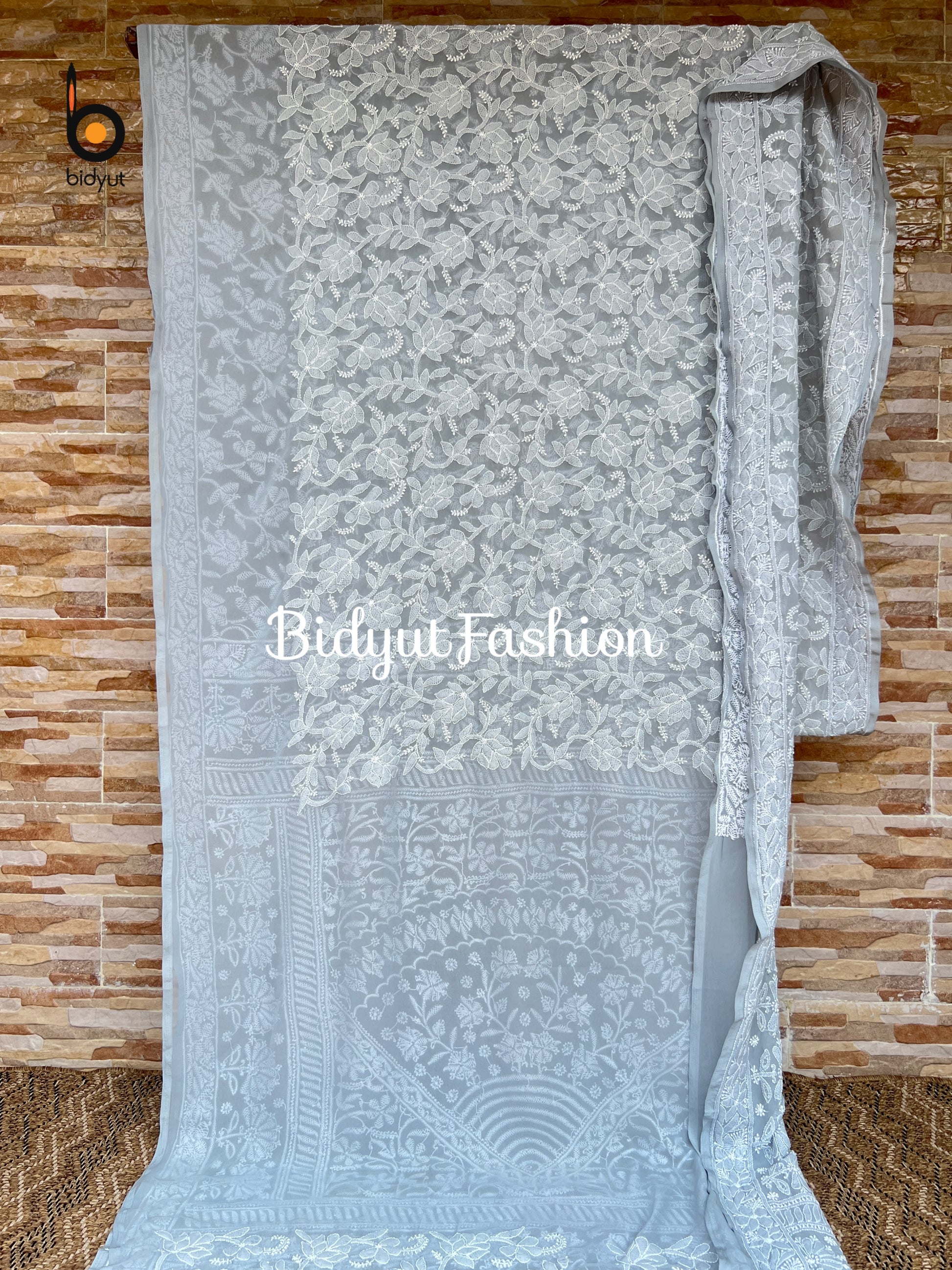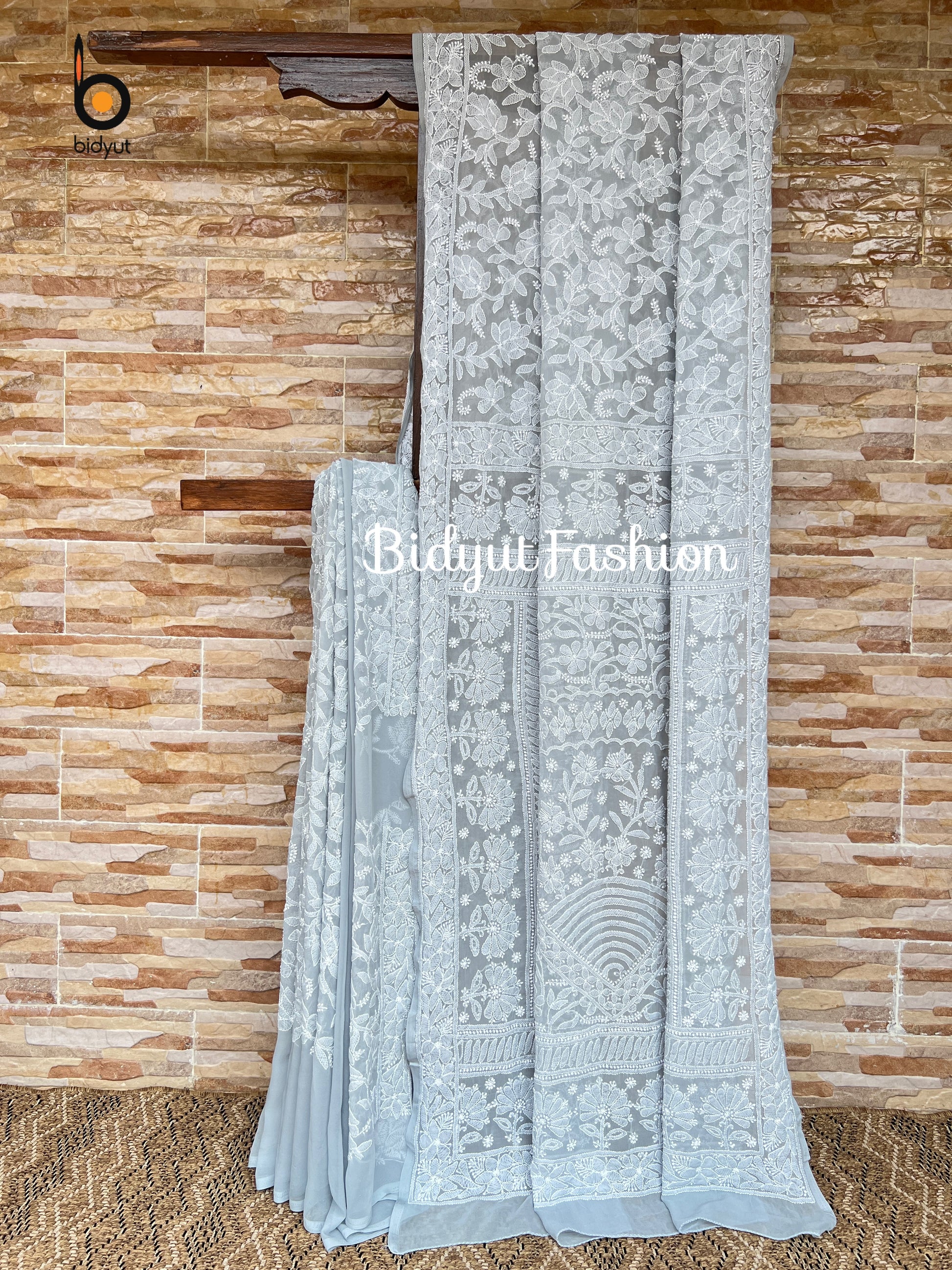 Lucknowi Chikankari all over work hand embroidery georgette Saree grey color