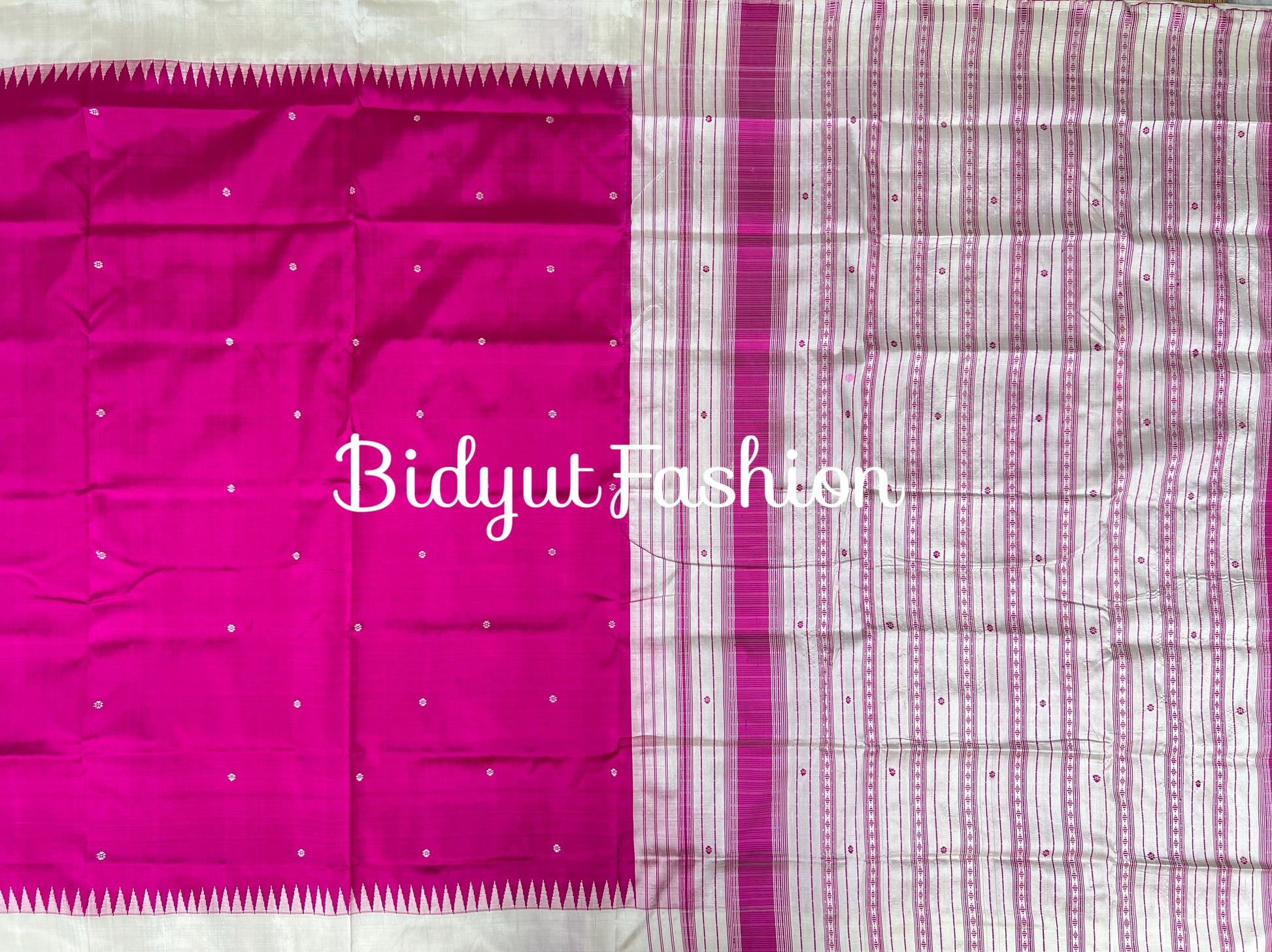 Experience the sheer elegance and timeless beauty of a single palla pink color Berhampuri Silk Saree with body check, a masterpiece originating from the silk city of India, Berhampur in Odisha. Renowned for its exquisite craftsmanship and rich heritage, this saree showcases the intricate Phoda Kumbha weaving technique, making it a true treasure of Odisha handloom using pit loom technique. A traditional palla extraweft weaving silk sari resonates a contemporary style enhanced with a contrast black color saree blouse.